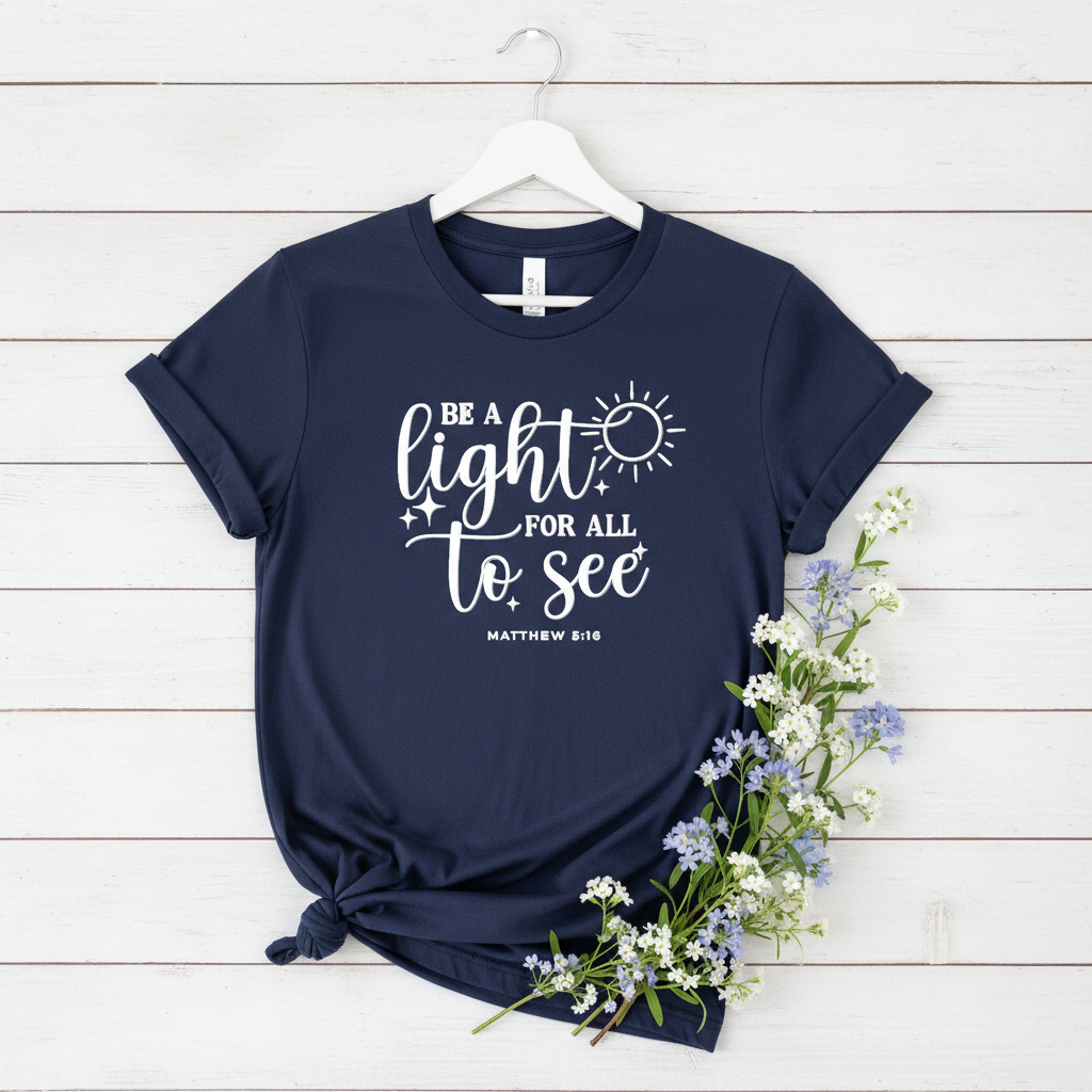A soft, meaningful tee that wears like a warm conversation. Lightweight ring-spun cotton gives this shirt a gentle drape, while the hand-lettered message — “Be a light for all to see” with a tiny sun and sparkles — reads like a quiet promise. It sits simply at the chest in a calm, script style that feels hopeful without shouting. Wear it to volunteer shifts, small group meetings, Sunday morning walks, or when you want to remind yourself and others to carry a little brightness through the day. The color tones blend with layered cardigans or denim, and the clean crew neckline keeps the look relaxed and easy to pair.