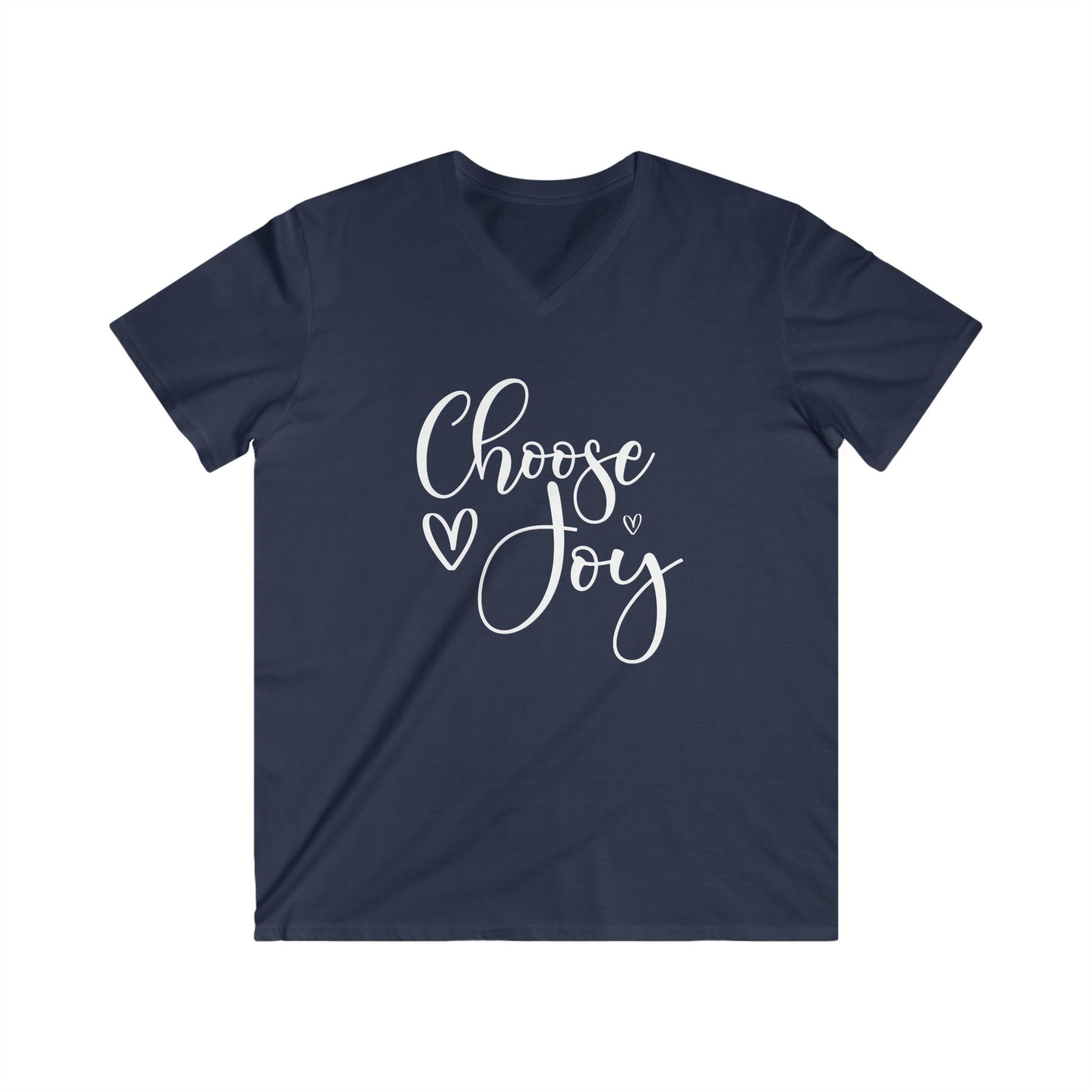 Light and effortless, this fitted V-neck tee carries a small but heartfelt message across the chest: "Choose Joy" in hand-lettered script with a tiny heart accent. It sits close to the body without clinging, draping like a lived-in favorite that encourages a deliberate, hopeful moment each time you put it on. Wear it on busy mornings, quiet afternoons, or on days when you need a gentle reminder to slow down and notice the good. The soft, breathable cotton blend and tear-away label keep you comfortable all day, while the ribbed collar and shoulder taping preserve shape through repeated wear and washing. Simple, sincere, and quietly uplifting — this tee slips easily into a closet of people who value meaning in everyday pieces and like to share a little warmth wherever they go.