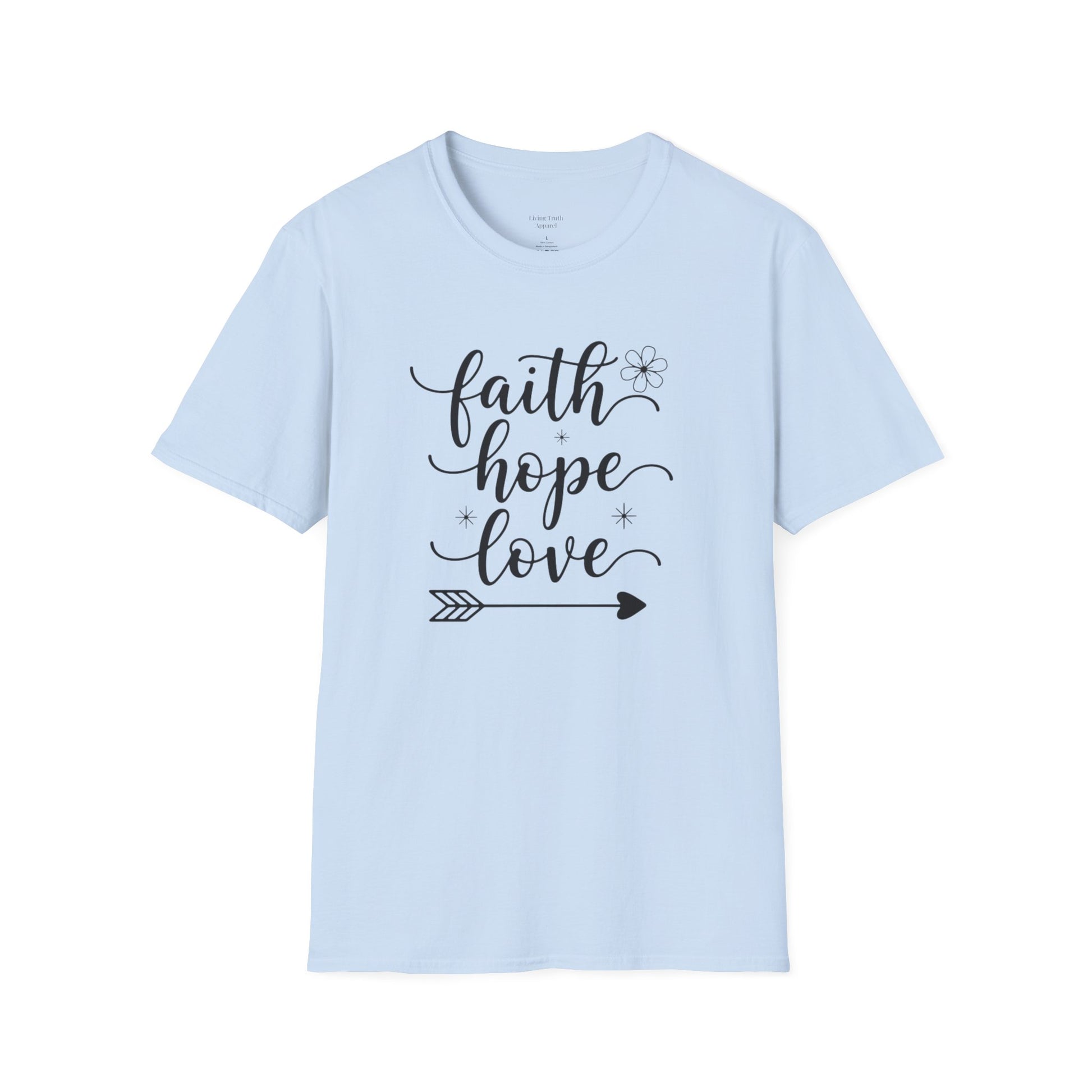Quiet, honest, and softly confident—this tee wears your beliefs like a gentle conversation. The hand-lettered “faith • hope • love” design in black ink rests on a light canvas, accented by a tiny arrow and stars. It reads like a quiet reminder you reach for on slow mornings, community gatherings, or when you want to wrap yourself in something calm and familiar. The crew neck and classic fit sit comfortably under a cardigan or on their own. It’s the kind of shirt that settles into everyday life: church potlucks, volunteer days, sunrise coffees, or long drives with a trusted playlist. Breathable, lightweight, and low-key, it feels lived-in from day one and keeps its shape through repeat wear.