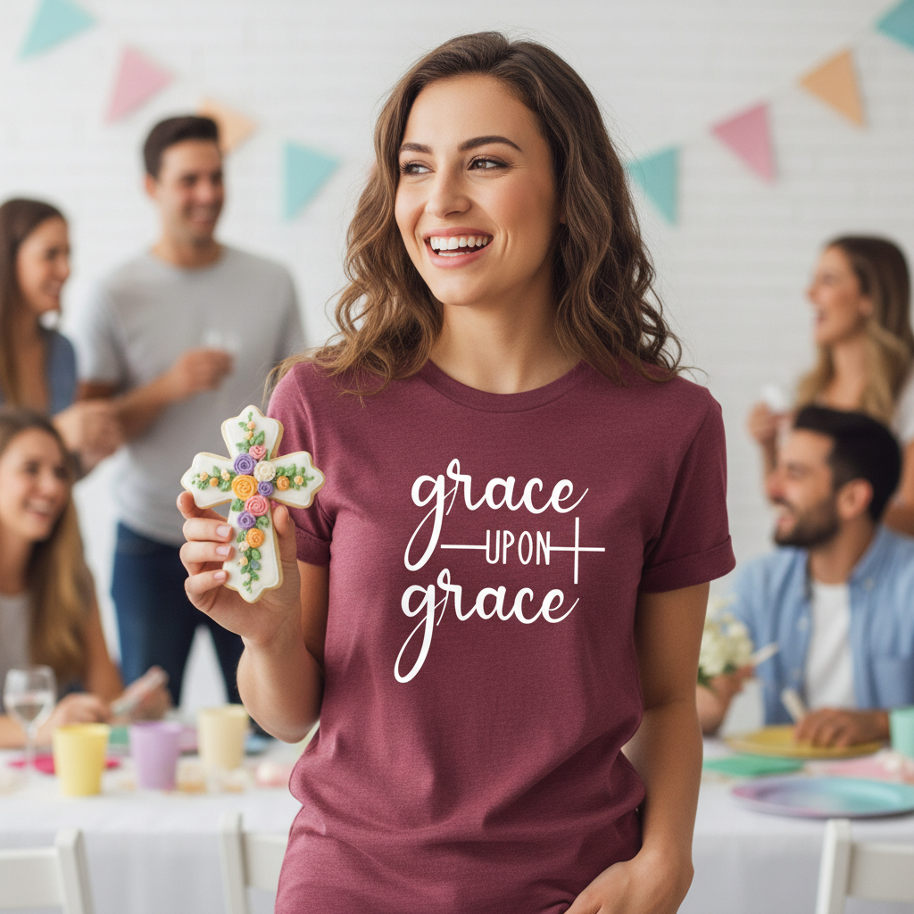 Soft, quiet, and sure — this tee wears like a gentle reminder. The lightweight cotton finish and clean crew neckline keep the silhouette simple so the hand-lettered “grace upon grace” message can breathe. It layers easily under a cardigan or over denim on a Sunday morning. Wear it to small group meetups, volunteer days, or whenever you want a subtle, faith-forward statement that feels like a conversation rather than a billboard. The smooth print sits flat against the fabric and moves with you, aging gracefully through washes while keeping its soft hand.
