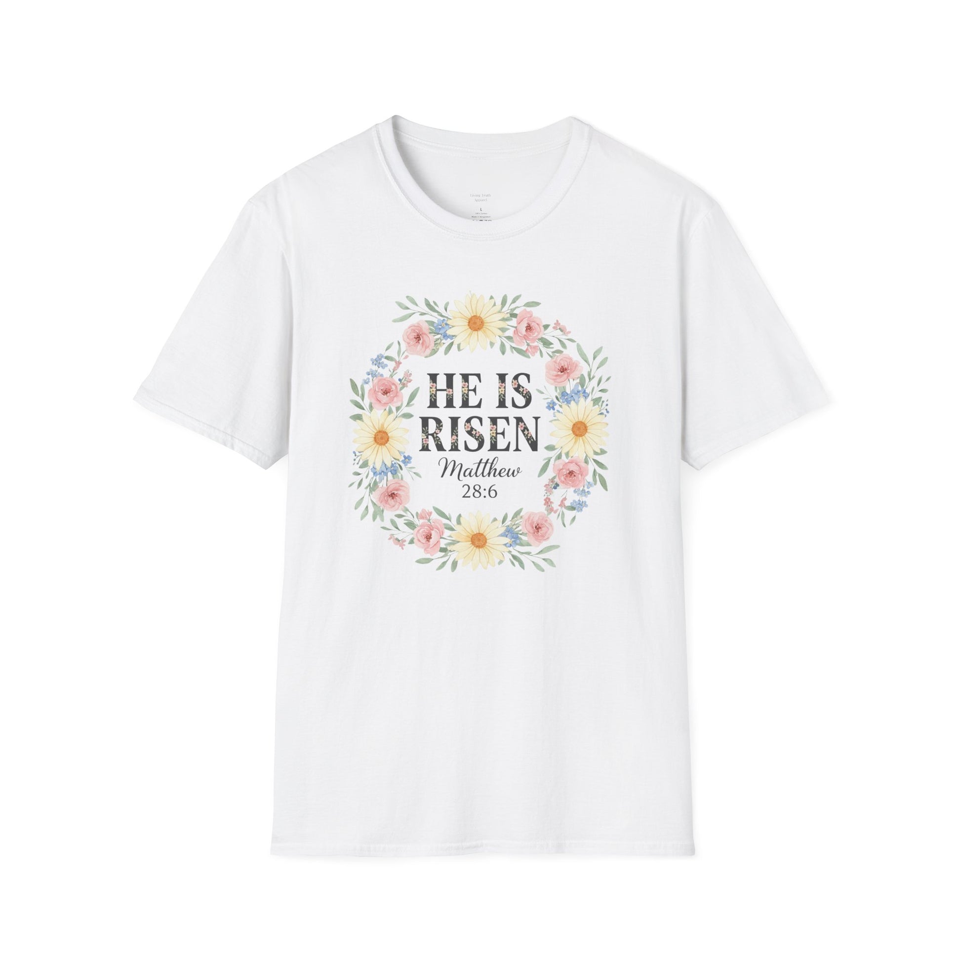 Soft, airy cotton meets a gentle, faith-filled design. This lightweight tee carries a delicate floral wreath framing the words “He Is Risen” with a small scripture reference beneath. The muted pastels and hand-drawn botanicals give it a quiet, hopeful look — as if you stepped into early-morning sunlight at a spring service. Wear it to feel calm, reverent, and connected: layered under a cardigan for sunrise gatherings or worn on its own during casual meetups with church friends. The simple crew neckline and classic fit keep the focus on the message, while the breathable fabric makes it comfortable through warm spring days and holiday services.