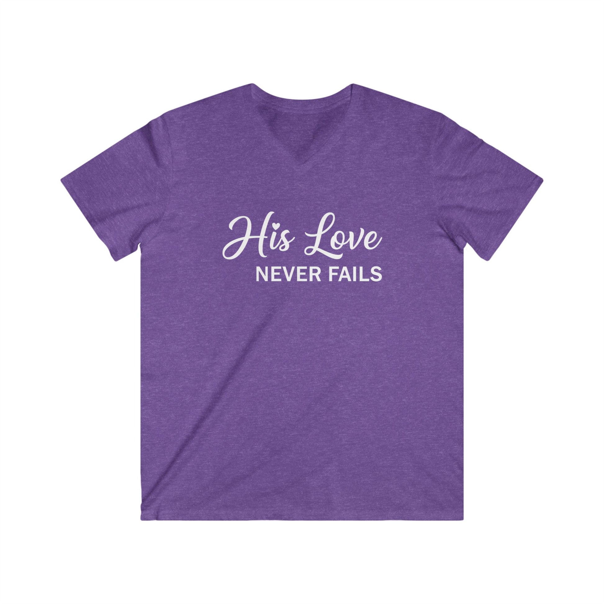 A lightweight fitted V-neck tee printed with a simple, faith-forward message: “His Love Never Fails.” Soft ring‑spun cotton and a semi-fitted cut keep the silhouette clean and comfortable, while the ribbed V-neck and shoulder tape give structure that holds up wash after wash. The understated tee and white script blend easily with jeans, layered jackets, or Sunday best—wear it to quietly share conviction, lean into community worship, or carry a calm reminder through everyday routines. Breathable and low-profile, this shirt sits close without clinging and moves with you whether you’re heading to a casual meet-up, a church gathering, or a reflective moment at home.
