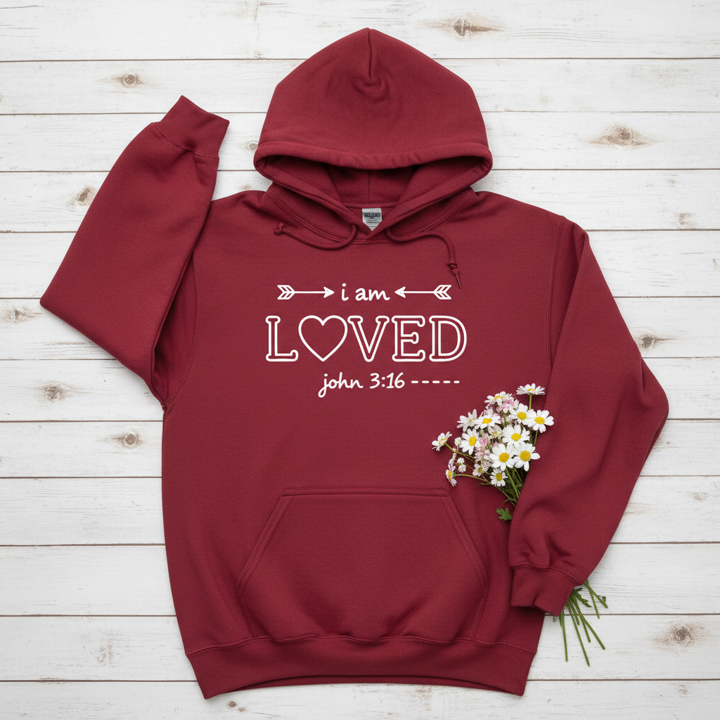 Soft, warm, and quietly expressive — this hoodie speaks faith and comfort in the same breath. The front features a hand-drawn style design reading “i am L♡VED” with John 3:16 beneath, framed by small arrow accents. The matte red fabric makes the white design pop, giving a modern, minimal look that’s easy to layer. Wear it to slow mornings with coffee, low-key church gatherings, or evenings around a fire; it feels like a gentle reminder you can carry with you. The roomy kangaroo pocket and double-lined hood keep you cozy, while the tubular knit and tear-away label keep things smooth against the skin. It’s a quiet, heartfelt piece that belongs in the wardrobe of someone who likes their faith expressed simply and sincerely.