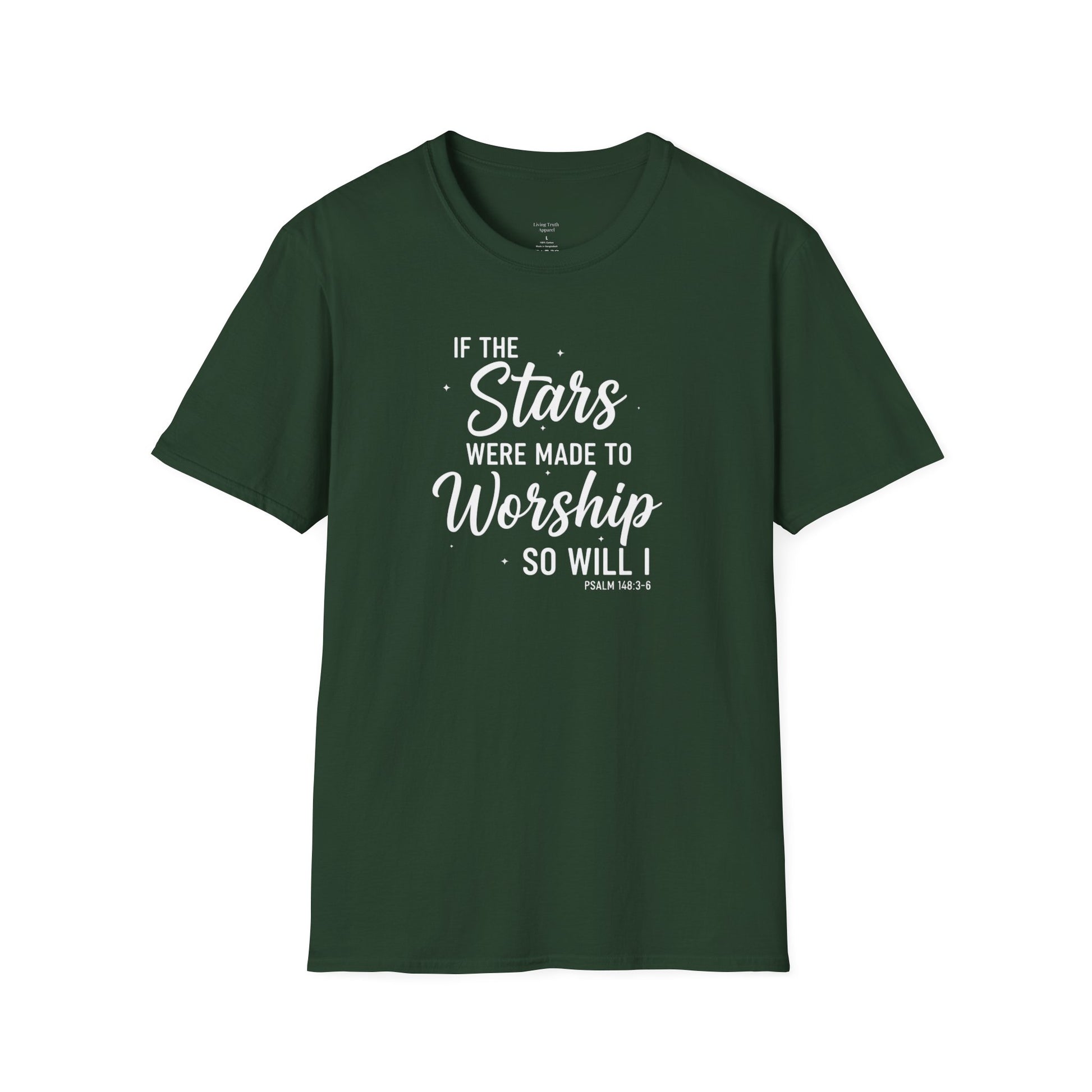 A soft, breathable tee that speaks softly and confidently about faith. The lightweight cotton feels gentle against the skin while the clean, hand-lettered print—"If the stars were made to worship so will I"—sits centered and subtle on the chest. Wear it to evening services, stargazing nights, or community gatherings; it layers easily under a jacket or stands alone with jeans. The classic crew neck and relaxed fit keep movement easy, while thoughtful construction means this shirt keeps its shape and wears well wash after wash. It’s for anyone who likes their message quiet but heartfelt, and who wants a comfortable shirt that travels from weekday routines to reflective moments under the sky.