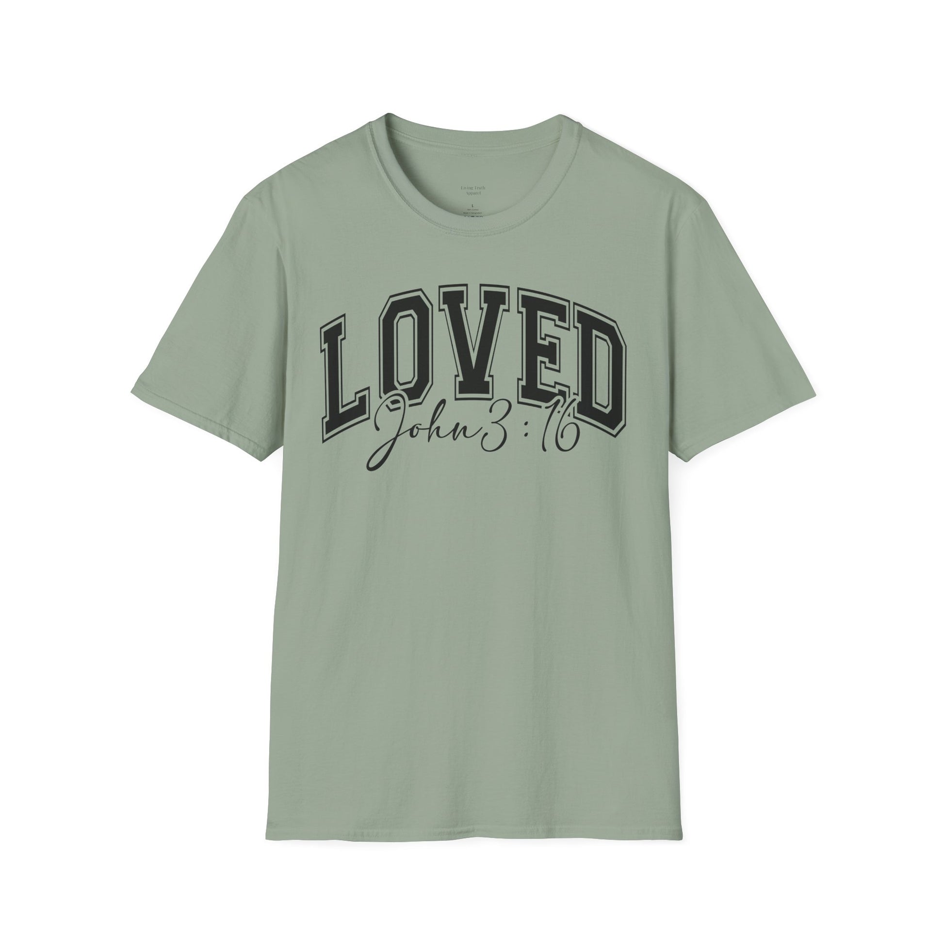 Soft, simple, and quietly confident — this lightweight tee carries a gentle message: LOVED, with a handwritten John 3:16 beneath. The muted sage color and collegiate-style block lettering softened by script make it easy to layer under a jacket, wear to weekend gatherings, or slip on after Sunday service. The fabric drapes smoothly and breathes through the day, so the shirt feels as calm as its message. Wear it to share faith without shouting, to comfort someone, or to keep close a reminder that you are seen and held.