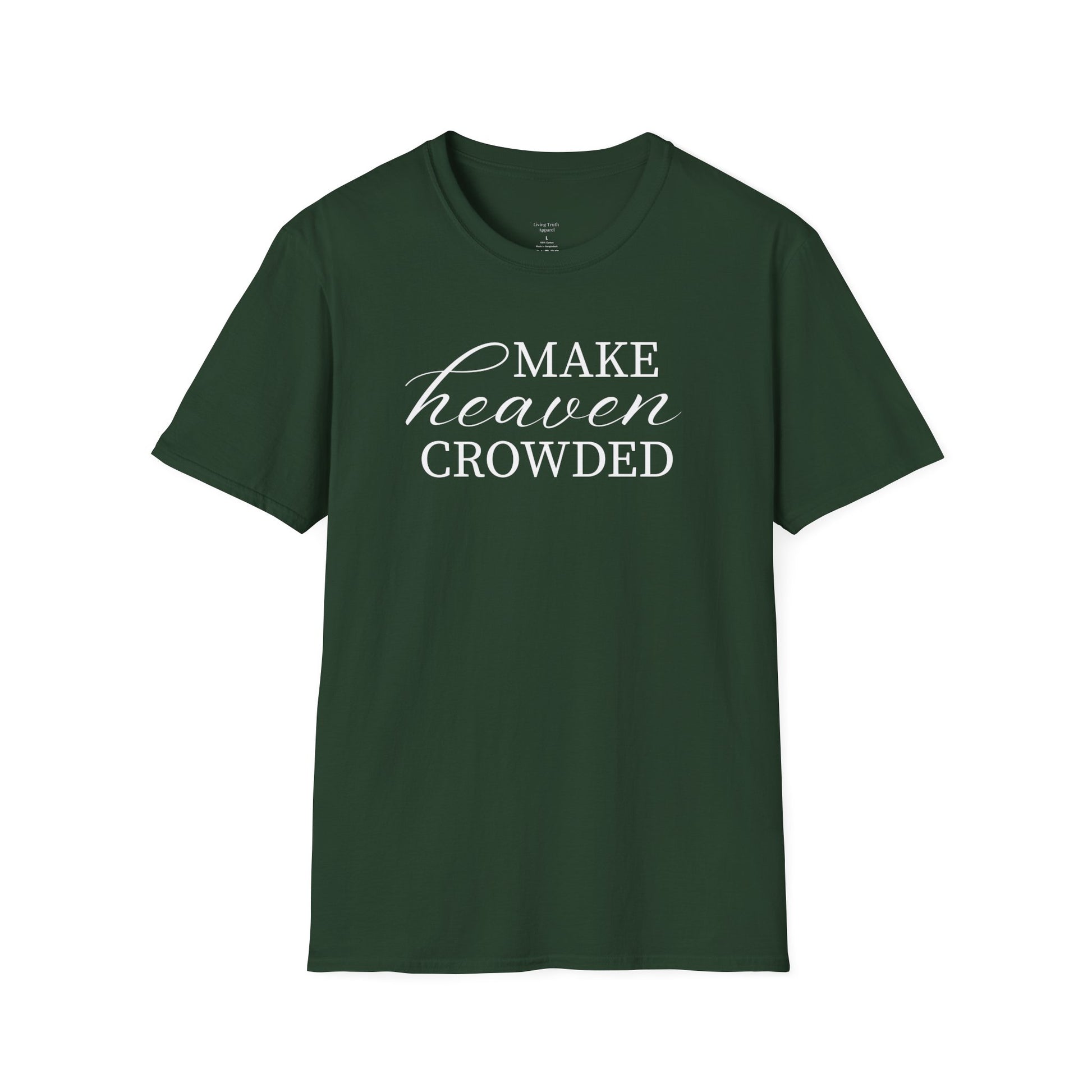 This lightweight cotton tee carries a clear, joyful message in elegant white script: “Make heaven crowded.” Soft against the skin and cut in a classic crew silhouette, it feels lived-in from the first wear. The clean, centered chest print reads with quiet confidence—easy to layer under a jacket or wear on its own. Wear it to church gatherings, outreach events, or casual days when you want your faith to speak gently but boldly. The smooth knit and tear-away label keep focus on comfort, while stable shoulder tape and a ribbed collar hold the shape through repeated wear and washes.