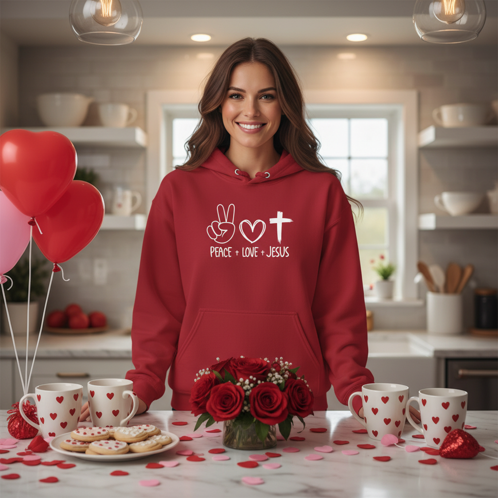 Soft, warm hoodie that carries a simple, faith-forward message: peace, love, Jesus. The hand-drawn icons and casual lettering give it a lived-in, comforting feel — like a favorite layer you reach for on cool mornings, volunteer nights, or church outings. The roomy kangaroo pocket and double-lined hood make it easy to layer over tees or button-ups. Subtle stitching and quality prints keep the design crisp wash after wash, while the relaxed fit lets you move freely during coffee runs, community events, or quiet Sunday afternoons.