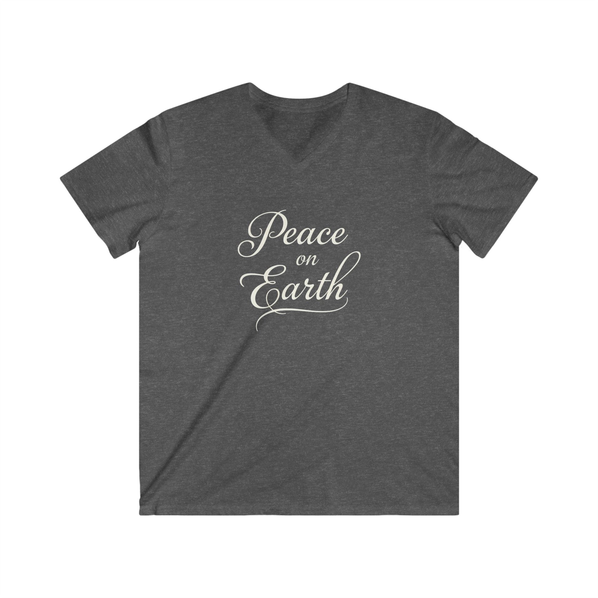 A soft, lightweight V-neck tee that speaks quietly but clearly: ‘Peace on Earth’ scripted across the chest in flowing, vintage-inspired calligraphy. The semi-fitted cut drapes neatly without clinging, letting the gentle message take center stage. Wear it when you want calm conversation, slow coffee, or a casual evening with friends who care about meaning more than noise. The ribbed collar keeps the neckline crisp. Smooth tubular knit and shoulder-tape reinforcement mean it holds shape through washes and weekend wear. Subtle, wearable, and sincere — this shirt slips into everyday life and becomes a quiet statement for moments that matter: neighborhood carols, volunteer days, or slow holiday gatherings.
