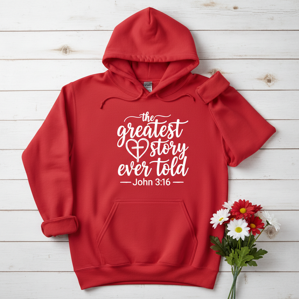 Wrap yourself in a quiet, steady reminder of faith. This cozy hoodie carries a hand-lettered message—“the greatest story ever told — John 3:16”—set in warm white on a cozy fleece. It’s the kind of piece you reach for when you want comfort and a gentle proclamation: morning coffee on the porch, late-night study sessions, or church gatherings when you want to feel both seen and grounded. The roomy kangaroo pocket and double-lined hood hold small essentials and create a reassuring cocoon. Thoughtful details—color-matched drawcord, tear-away label, and soft medium-heavy fabric—make it easy to wear all season. Whether layered under a coat or worn on its own, this hoodie reads like a quiet conversation starter for people who carry their faith into everyday life.
