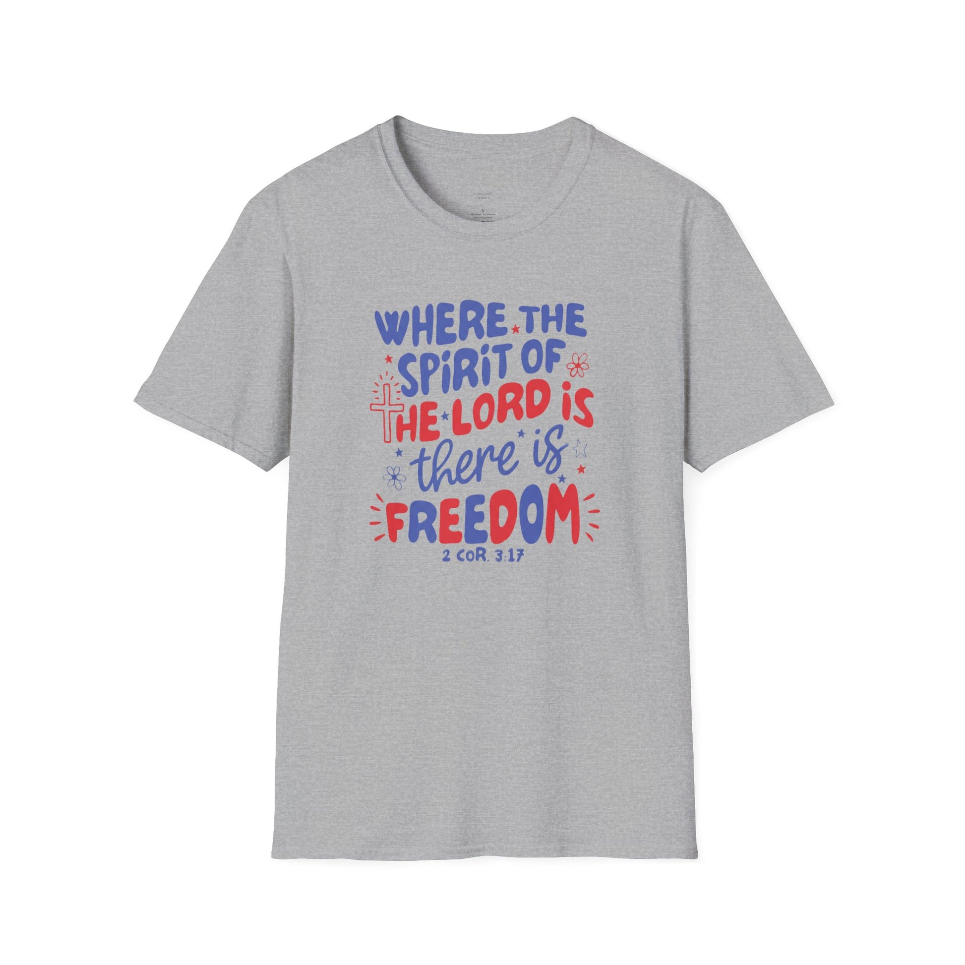Lightweight, breathable, and softly worn—this cotton tee carries a hopeful message in hand-lettered color. The front art reads “Where the Spirit of the Lord is there is freedom” in playful, uplifting typography with small crosses and accent marks. It feels like the kind of shirt you reach for on calm mornings, community gatherings, or when you want to share faith without shouting. The fabric drapes easily, the crew neck stays in shape, and the smooth print sits comfortably against skin. Wear it layered under a jacket, to a church event, or on relaxed weekends when you want a quiet statement of belief and belonging.